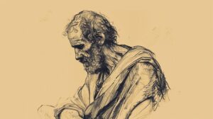 Job drops his head in exhaustion. He picks up a piece of pottery and starts scratching himself to bleeding again. His friends silently watch him. When he receives a little relief, he raises his head a little.