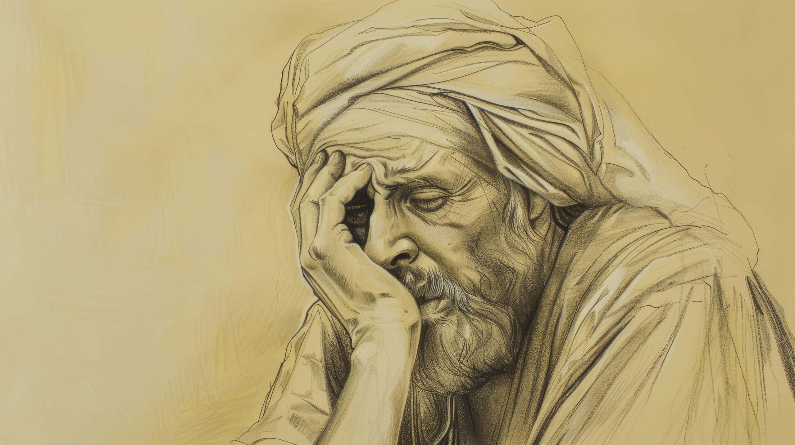 Job drops his head and tears fall down.