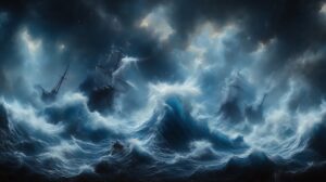 Midday, the clouds begin to gather. They are ominous! Within an hour, they are pouring down torrential rains and the ship is being bucked about by the sea like a leaf in a whirlwind. The sailors are doing everything they can to keep from capsizing or breaking apart.